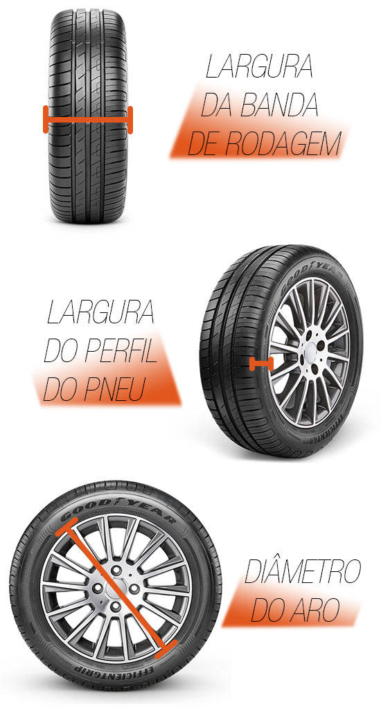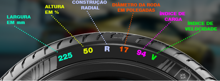 Vamos usar um pneu com 225/50R17 94V de dimensões para a explicação: