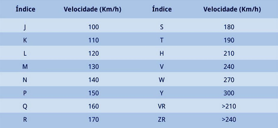V: é a referência ao índice de velocidade, através dessa letra você pode ver a velocidade máxima suportada pelo pneu. Esse índice é padrão e também possui uma tabela. Em nosso exemplo o V corresponde a uma velocidade máxima de 240Km/h.